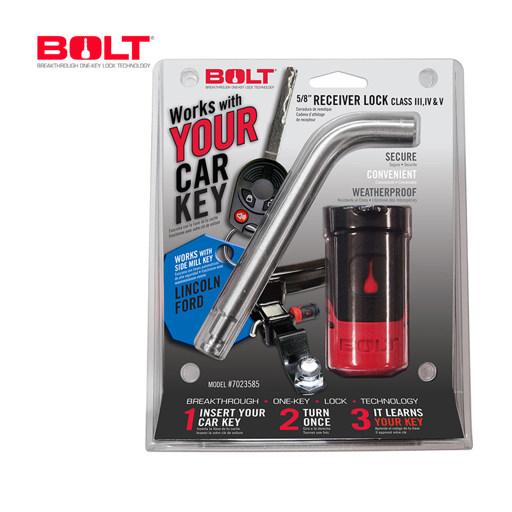 Featuring patented BOLT Breakthrough One-Key Lock Technology the BOLT Receiver Hitch Lock works with your vehicle ignition key. Use the BOLT Receiver Hitch Lock to secure your hitch to your truck and never worry about losing or having to remember which key goes to your receiver lock again! Available with either a 1/2" or 5/8" diameter pin the BOLT Receiver Hitch Lock is suitable for Class 1-5 towing applications. Featuring an automotive grade lock cylinder and a stainless steel lock shutter and cap to keep out dirt and moisture, each BOLT Receiver Lock comes with a solid stainless steel pin and a weather resistant jacket ensuring the long life of your lock.