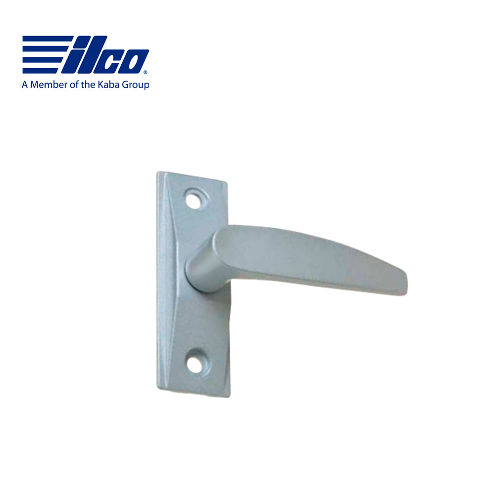 ILCO right-handed straight lever handle with aluminum finish. Levers are designed to keep fingers away from the jamb and allow operation without grasping. A downward movement retracts latch.